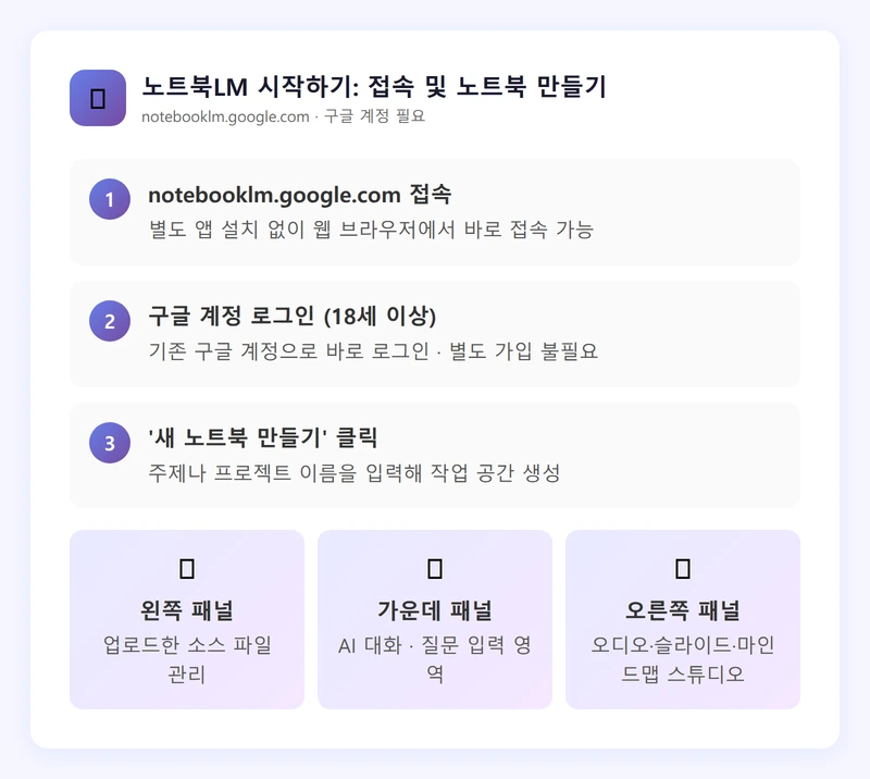 노트북LM 사용을 위한 첫 번째 단계는 접속인데요. 웹 브라우저에서 notebooklm.google.com에 접속하면 바로 시작할 수 있습니다. 별도의 앱 설치 없이 브라우저만 있으면 되는데요.