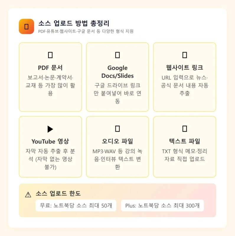 가장 많이 쓰이는 형식인데요. 보고서, 논문, 계약서, 교재 등을 PDF로 올리면 내용을 바로 분석해줍니다. 무료 버전에서는 노트북당 최대 50개 소스, 소스당 최대 500,000단어까지 처리 가능합니다.