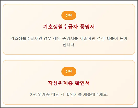 선택 서류의 경우 제출이 필수는 아니지만, 경제적 어려움을 객관적으로 증명할 수 있는 자료이다보니 제출하시면 선정 확률이 높아질 수 있는데요. 가능한 서류는 최대한 준비해서 함께 제출하시는 것을 권장드립니다.